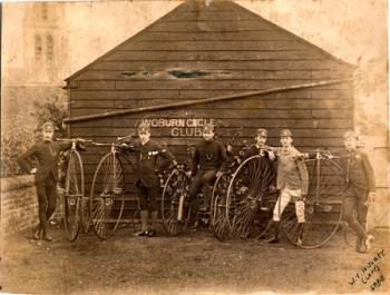 - TitleWoburn Cycle Club team, with cycles, in the back garden of the Hulatt family home, 17, Bedford Street [adjacent the Magpie Inn], posing in front of the stable belonging to Negus, butchers. Thomas W. Hulatt in centre, seated. Part of St. Mary's old church spire in background