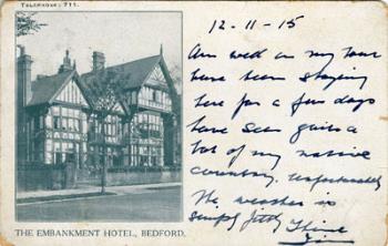 - TitleCard showing The Embankment Hotel Bedford. Sent to Mrs. Loughlin Murphy, Loughyn, New Brighton, Cheshire from Iain. Bedford postmark. Publisher unknown.