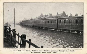 - TitleView of flooding on The Midland Train passing through Bedford. (The Great Floods were on 30 April 1908). Sent to Mr. E Thatcher, 128, Cromwell Road, Redhill, Surrey from Bert. Bedford postmark. Published by G. H. Stonebridge 4 Midland Rd., Bedford.