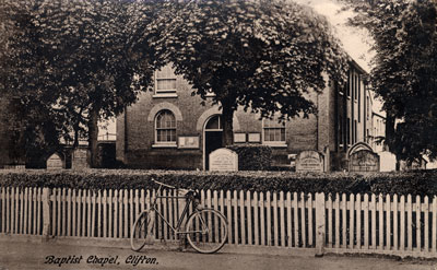Baptist Chapel, Clifton. Front of baptist chapel with bicycle standing against the fence. Two versions of card, one with border one without. A has no indication of publisher but B is by Elphick, Biggleswade. A is unused.