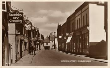 - TitlePostcard titled "HITCHIN STREET, BIGGLESWADE" showing a view looking down the road-way with The Black bear PH on the left. The card is unused. Publisher unknown.