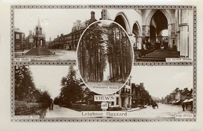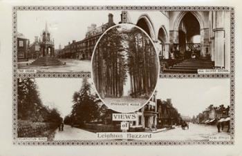 - TitleMulti-view card with the caption Views of Leighton Buzzard. shows Plantation Road, High St., All Saints Church, Stockgrove Woods and The Cross. Sent to Miss D. Tirney, 3 Presburg Road, New Malden, Surrey.Post marked Leighton Buzzard. Published by Kingsway Real Photo Series.