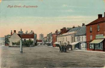 - TitleCard titled 'High Street, Biggleswade', showing view towards church looking down the High Street with Lant Bedding and Furniture Stores on the right.