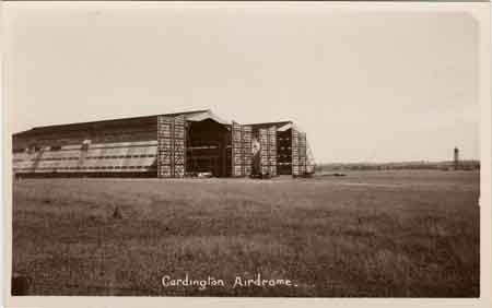 - TitleCardington Airdrome. View of the sheds with their doors open taken from the north west, the mast can be seen in the distance to the far right. Two biplanes are parked outside the sheds.