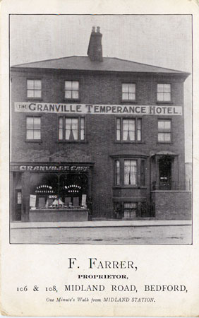 - TitleA portrait view card of The Granville Temperance Hotel in Midland Road. Noted underneath the picture is 'F.Farrer, Proprietor, 106 & 108 Midland Road, Bedford, One Minute's Walk from Midland Station'. No indication of publisher. Card is postally unused.
