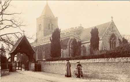 - TitleAll Saints Church, Turvey from outside the boundary wall looking towards the lych gate and the church and tower in the background. In the centre are two ladies - one holding a bicycle. Published by A M Pepper, Victoria Road, Scarborough. Not postally used.
