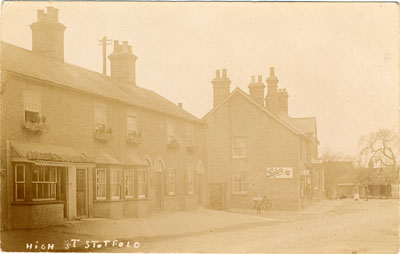 - Title'High St Stotfold'. View looking west towards Brook Street from High Street. The row of cottages next to Chapel path and W J Howe's shop to the far left of the image and the post office and bakery in the middle and background.