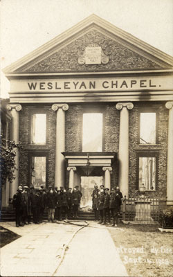 - Title'Wesleyan Chapel Dunstable destroyed by fire Sept 14 1908'. Portrait view of the surviving facade of the chapel. The damaged interior can be seen through the glassless windows and door. Outside the front door standing in two groups are firemen, policemen and several male civilians, with a hose pipe going back down the path. No indication of publisher.