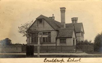 - TitleSouldrop School. Built in 1868 by the Duke of Bedford, the gable end faces the High Street and several tall single and double shafted chimneys can be seen. The school stands behind a picket fence and gate; and in front is a green, on which there is a small tree next to a road sign indicating Bedford Road pointing east. "Souldrop School" is annotated on the front of the card. No publisher stated.