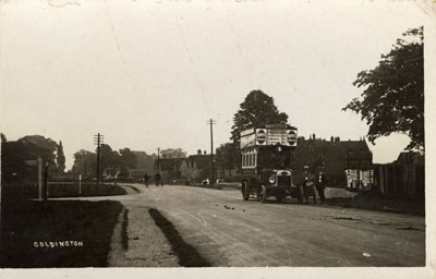 'GOLDINGTON'. Looking east along Goldington Road, an open-topped motorised Omnibus No.4 travelling west, has stopped at the side of the road, where the conductress and driver are standing as if posing for this photograph. The destination of the bus is indicated as 'CLAPHAM VIA GOLDINGTON RD. ST. PETER'S ST. TAVISTOCK ST. CLAPHAM RD'. The word 'MAPLE' appears on each side of these stopping points on the front of the bus and other advertising hoardings are on the side of the upper deck. To the left is the turning to Goldington Green, marked by a sign post. Two cyclists are in the road travelling east and figures can be seen in the distance in front of houses at the side of the road. Beyond them, in the far distance is The Swan Inn. No publisher stated. Card unused.