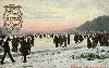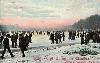 Title: Postcard titled "Skating On Longholme, Bedford 1904" showing a large crowd of people on the iced lak...